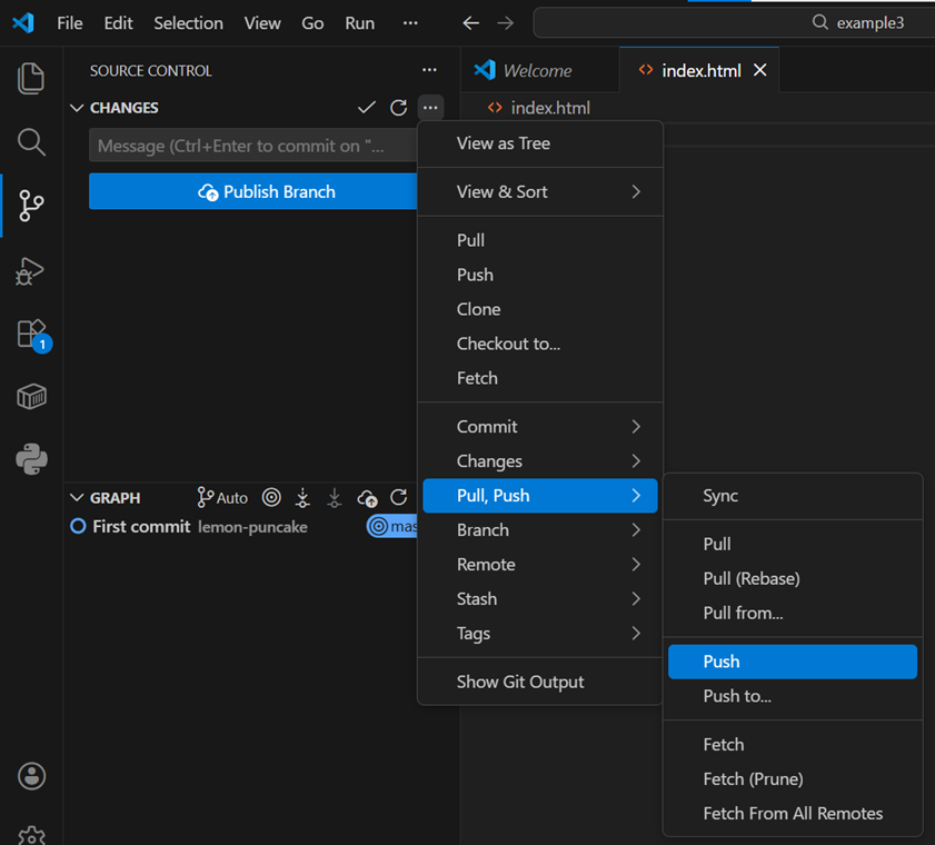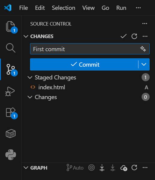 5. Переходим во вкладку Source Control. Нажимаем на +(stage changes) рядом с файлом. Называем коммит и нажимаем Commit